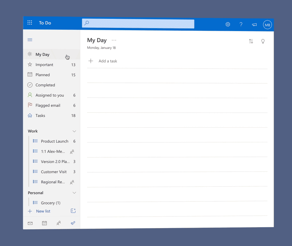 Administra tus tareas más fácilmente con inteligencia: disponible para los usuarios de To Do web en inglés, Microsoft To Do usará IA para ayudarte a planear mejor tu día y centrarte en las tareas que te importan. La IA en To Do te ayudará a identificar las tareas que parezcan importantes en función de palabras clave y fechas límite, y las sugerirá en Mi día para garantizar que estés al día de tus tareas clave y seas más productivo cada día. Empieza a usar Microsoft To Do hoy.